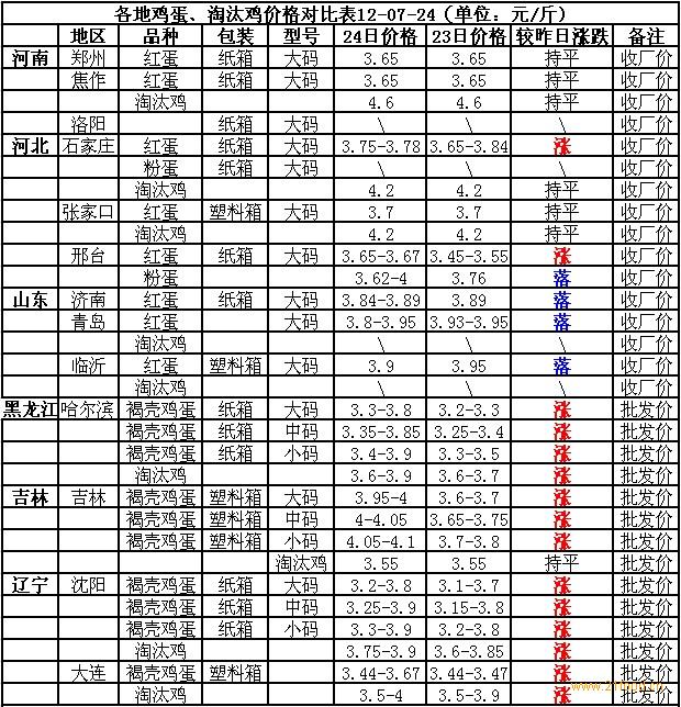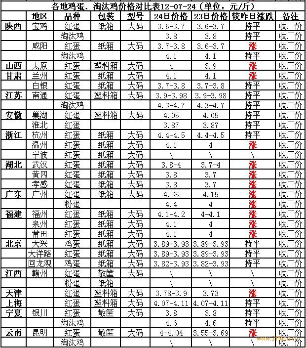 7月24日各地鸡蛋、淘汰鸡价格对比表