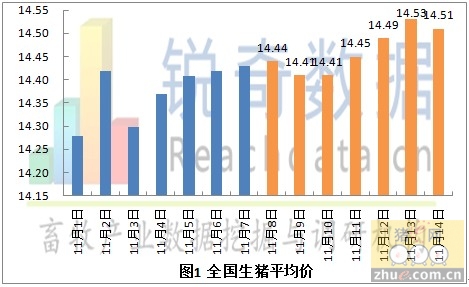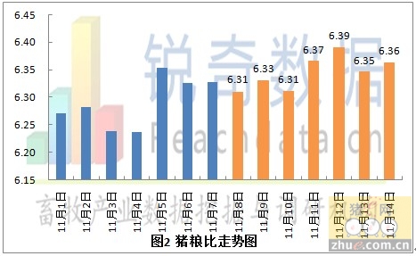 发改委称,11月7日全国大中城市生猪出场价格为每公斤14.69元,比10月31日价格回落0.14%;同期玉米批发价格下跌0.83%至每公斤2.38元,令期内猪粮比价上升0.65%至6.17。