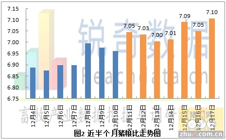 据锐奇数据监测的当地生猪报价信息统计,2012年12月18日全国各省生猪平均价格为16.16元/千克,较昨日上涨0.05,涨幅为0.31%,较上周同期(12月11日)上涨0.13元/公斤,涨幅为0.81%(见图1),今日猪粮比为7.10:1,较昨日上涨0.05,涨幅为0.71%,较上周同期(12月11日)上涨0.14,涨幅为2.01%(见图2)。