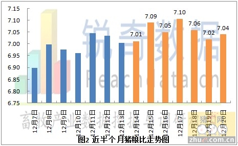 据锐奇数据监测的当地生猪报价信息统计,2012年12月21日全国各省生猪平均价格为16.17元/千克,较昨日下跌0.01,跌幅为0.06%,较上周同期(12月14日)上涨0.09元/公斤,涨幅为0.56%(见图1),今日猪粮比为7.04:1,较昨日上涨0.02,涨幅为0.28%,较上周同期(12月14日)上涨0.04,涨幅为0.57%(见图2)。