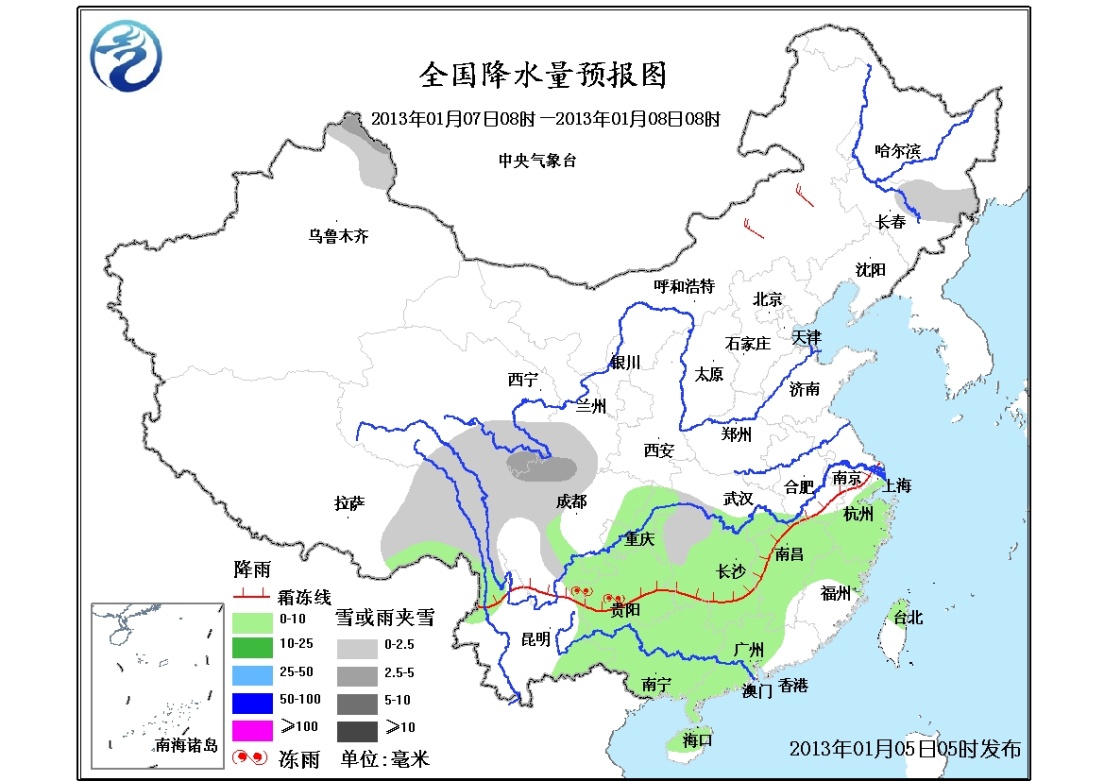 5日~7日,西南地区东部、江汉南部、江南大部、华南中西部、青藏高原东部等地将持续雨雪天气,其中,5日,贵州中部、湖南西南部、江西中部偏西等地的部分地区有冻雨。