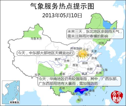 预计10日08至11日08时,江西南部、浙江东南部、福建东部和南部、广东、广西中东部、云南南部和西部、台湾西北部以及黑龙江中部等地的部分地区有大雨或暴雨,广西东部、广东西部局地有大暴雨(100-130毫米);上述地区局地并伴有短时雷雨大风或冰雹等强对流天气。