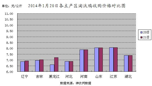 2014年1月20日全国淘汰鸡价格平均为3.76元/斤,较1月19日下降0.02元/斤,其中淘汰鸡价格最高地区为新疆石河子5.00元/斤,最低地区为河北衡水3.20元/斤。
