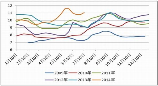 扣除掉2013年供应过剩部分,今年鸡蛋市场总体格局应该是供应偏紧。2013年年底的禽流感清除掉了一批养殖户,这是今年补栏难以弥补的一个缺口。上半年补栏情况总体稍弱或持平于去年同期,存活下来的养殖户基本上是满栏状态,产能有减未增。在当前时间点,能够影响到1501合约的最大供应因素是8、9月份的蛋鸡集中淘汰量,至于9月之后的补栏,对于明年1月的供应影响很小。