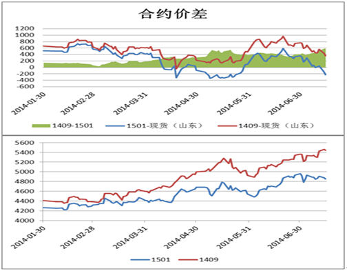 在现货价格大涨的情况下,1501合约却背道而驰,提前反映了市场对后市现货价格下跌的预期。但今年的大背景是供应偏紧,预计10月之后现货价格维持在4元/斤以上的概率较大,按400元/500千克的交割费用估算,1501合约下方空间或至4400元/500千克左右,目前1501贴水现货高达600元/500千克,待9月合约摘牌后,若现货下跌幅度并不如预期,1501合约或有修正的要求。