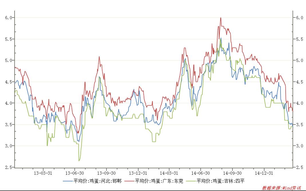 从育雏鸡到产蛋鸡需要5个月左右的时间,由于2014年高蛋价带来的养殖利润大幅增加,养殖户在去年10月开始纷纷淘汰老鸡,增加后备鸡的存栏量。据统计,今年2月,我国在产蛋鸡存栏量环比上涨2.4%,同比上涨14.7%。随着在产蛋鸡的存栏结构逐渐改善,预计4—5月鸡蛋供应将会进一步增加。