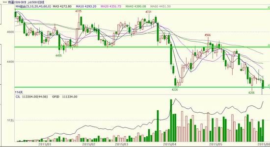 5月鸡蛋1509合约基本上维持弱势下挫,在5月底6月初回探到前低附近止跌震荡,不过基于现货的弱势以及期价高升水的状态下,期价继续下挫的可能性较大,一旦下挫前低4200-4230附近支撑,下方空间较大,中期支撑可能下探到3800-3900寻找支撑;在操作上仍建议逢高寻找沽空点位为宜。