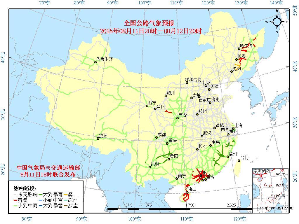 中国气象局与交通运输部2015年08月11日联合发布全国主要公路气象预报