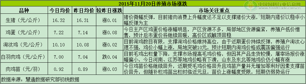 肉禽养殖市场上,本周肉鸡肉鸭价格涨势进一步放缓。由于养殖成本继续下调、生猪价格弱势调整,加上其他诸多因素叠加的影响,肉禽价格要实现继续上涨缺乏足够动力。看后期,随着气温继续下降、腊肉腌制以及冬季整体肉食品消费有望增加利好,加上肉鸡肉鸭自身价格目前仍旧处于低位,因此我们预计11月下旬开始肉禽价格将伴随着生猪行情的上涨,出现一定的上涨。