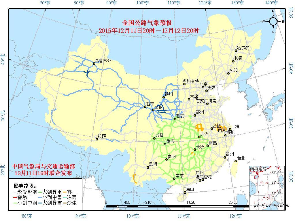 中国气象局与交通运输部2015年12月11日联合发布全国主要公路气象预报