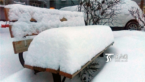 11日晨,乌鲁木齐街边椅子上的积雪厚度惊人。