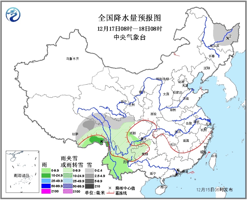 受南支槽和静止锋影响,15至16日,西南地区东部等地有小到中雨或雨夹雪,其中15日云南南部局地有大雨。