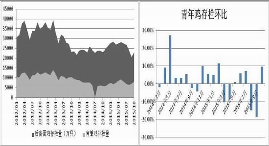在蛋鸡供应节奏中,我们不得不考虑后备蛋鸡的整体情况,关系到中期鸡蛋市场供应的稳定性问题,后备蛋鸡供应,我们主要分析育雏蛋鸡补栏情况以及青年蛋鸡补栏情况;10 月份,后备鸡存栏量为 2.3 亿只,较 9月大幅增加 11.77%,同比增加 0.32%。后备鸡增加的原因,主要是 10 月育雏鸡补栏量出现大幅增加。三季度,9、10 月上游育雏蛋鸡补栏情况较为积极,对于中期 4-5 个月市场的供应有所好转,但我们也发现育雏蛋鸡在后备蛋鸡占比并不高,对于中期新开产蛋鸡的影响相对有限,我们仍需要关注青年蛋鸡补栏的情况;而目前来看,养殖利润偏弱,市场直接补栏青年蛋鸡意愿降低,后备蛋鸡整体数量依然处于偏低的水平,2016 年初期,蛋鸡市场供应的稳定性,仍存在一定的疑虑,也正是这种不确定性因素,以及二季度补栏有限令四季度在产蛋鸡存栏减少等综合影响,对鸡蛋现价形成一定的支撑;更长周期市场的供应情况仍需我们进一步动态的跟进。