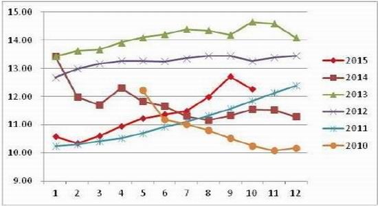 从芝华公布的蛋鸡供应数据来看,自 2015 年伊始,在产蛋鸡环比持续增加,令蛋鸡市场的供应出现了明显的好转,新开产蛋鸡的增加令 2015 年整体行情走势偏弱,震荡重心回落,近期三季度受到季节性因素影响而出现传统旺季,不过由于 2015 年二季度补栏有限,导致 2015 年四季度新开产蛋鸡出现减少,从芝华数据公布的10 月份蛋鸡数据来看, 10 月在产蛋鸡存栏量 12.27 亿只,环比减少 3.47%,环比在八个月以来首次出现调降,市场弱势的现价获得短暂支撑;但同比去年增加 6.34%,总体来看,在产蛋鸡存栏总体依然稳定,令价格的重心的高度或有限,中长期价格仍将承受明显压力;不过影响鸡蛋供应市场的因素是动态发展的,我们仍需要关注各个环节中供应的改变以及养殖利润以及饲料成本等因素。
