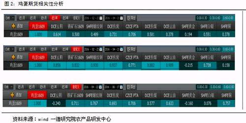 图2是鸡蛋期货近1年,2月22日-4月21日,4月22日-至今的相关性数据,可以清楚的看到长期鸡蛋和其他品种相关性一般,最高只有0.7左右,但是2月22-4月21日和焦炭螺纹相关性达到0.93高度相关,近期回落至0.75左右。通过这一系列数据可以看到有时候行情不止是被基本面影响也可能被宏观等一系列品种外因素影响,在实际投资或分析中需要充分考虑。