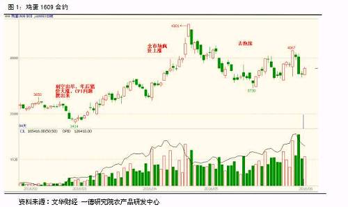 增加的预期,正月十五后,猪肉蔬菜等全面上涨,CPI问题摆出来,鸡蛋期价开始引入新的预期,止跌回升。3-4月,现货的持续稳中有涨配合黑色期货的暴涨,使得鸡蛋期价再度推升一个高度,到顶点当天价格打到4301,透支了上涨预期。5月至今,很快市场开始去泡沫之旅,当4300回落到3700后,市场进入静默期也没什么题材,直到豆粕异军突起,在鸡蛋现货超预期下跌时,托起了鸡蛋期货价格,整体呈现震荡走势。