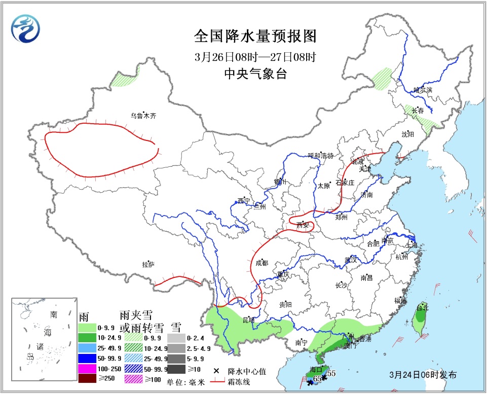 26日08时至27日08时,内蒙古东部、吉林南部等地有小雪或雨夹雪;云南、华南中东部等地有小到中雨或阵雨,海南岛的部分地区有大雨,局地有暴雨(50~65毫米)。内蒙古中西部、华北中西部、黄淮等地有4~5级风(见图3)。