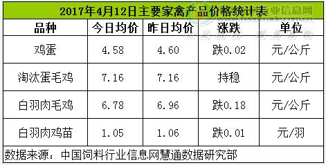 据饲料行业信息网慧通数据研究部数据统计,2017年4月12日中国主要家禽产品价格稳中下跌。其中鸡蛋价格跌幅缩小,淘汰蛋毛鸡价格继续调整;白羽肉毛鸡价格继续下跌,白羽肉鸡苗价格止涨趋稳。