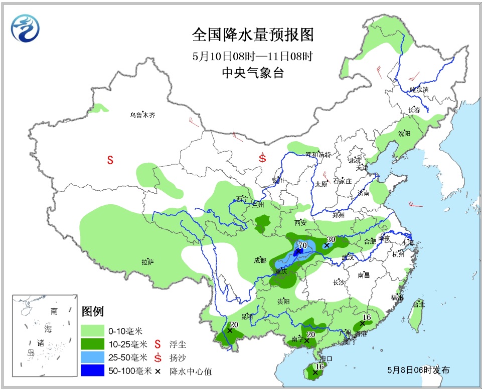 受高原槽和低涡切变线影响,8日,浙江中西部、福建西部、江西中南部、湖南南部、广东中北部、广西东部等地的部分地区有大雨,其中,浙江西南部、福建西北部、江西南部和东北部、广东北部等地局部有暴雨(50~90毫米),上述部分地区并伴有短时强降水或雷暴大风,小时雨强20~50毫米,最大可达60毫米以上。为此,中央气象台5月8日06时继续发布暴雨蓝色预警(图1)。