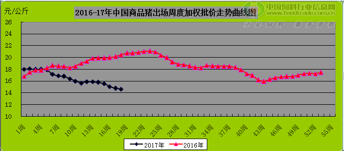 生猪价格方面,根据中国饲料行业信息网慧通数据研究部的统计数据显示,2017年第18周出栏商品大猪价格环比下跌,其中出栏外三元大猪周度均价14.73元/公斤,环比下跌1.04%,同比下跌28.53%;出栏内三元大猪周度均价14.45元/公斤,环比下跌0.82%,同比下跌28.71%;出栏土杂大猪周度均价14.14元/公斤,环比下跌0.84%,同比下跌28.91%;外三元、内三元及土杂猪周度加权均价14.59元/公斤,环比下跌0.95%,同比下跌28.55%;仔猪周度均价42.06元/公斤,环比下跌0.38%,同比下跌13.99%。