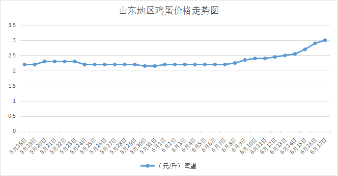 鸡病专业网消息:6月17日,山东地区莱阳鸡蛋3元/斤,涨;枣庄鸡蛋3元/斤,涨;莒南鸡蛋3元/斤,涨;临沭鸡蛋3-3.05元/斤,涨;沂南鸡蛋3元/斤,涨;沂水鸡蛋3元/斤,涨;日照鸡蛋3元/斤,涨;曹县鸡蛋90-91元/30斤,涨;威海鸡蛋2.95-3元/斤,涨;梁山鸡蛋135元/45斤,涨;诸城鸡蛋3.1元/斤,涨;泗水鸡蛋135元/45斤,涨;莱芜鸡蛋135元/45斤,涨;滨州鸡蛋118元/40斤,涨;夏津鸡蛋135元/45斤,涨;平原鸡蛋135元/45斤,涨;章丘鸡蛋137元/45斤,涨;济阳鸡蛋137元/45斤,涨;青岛鸡蛋3.25-3.3元/斤,涨;商河鸡蛋135元/45斤,涨;定陶鸡蛋135元/45斤,涨;单县鸡蛋92元/45斤,涨。