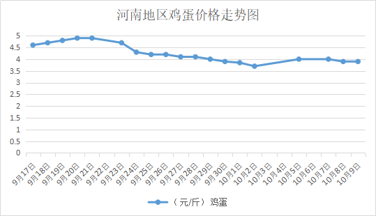 鸡病专业网消息:10月9日,河南荥阳鸡蛋3.9元/斤,稳;中牟鸡蛋3.9元/斤,稳;周口鸡蛋3.8元/斤,稳;商丘鸡蛋111元/30斤,落;鹤壁鸡蛋3.8元/斤,稳;汝州鸡蛋3.85元/斤,落;开封鸡蛋111-112元/30斤,落;漯河鸡蛋3.9元/斤,稳;漯河临颍鸡蛋3.9元/斤,稳;许昌鸡蛋3.9元/斤,稳;南阳鸡蛋4元/斤,落;南阳邓州鸡蛋4元/斤,落;新乡鸡蛋3.9元/斤,稳;安阳鸡蛋3.9元/斤,稳;新郑鸡蛋3.9元/斤,稳;登封鸡蛋3.9元/斤,稳。