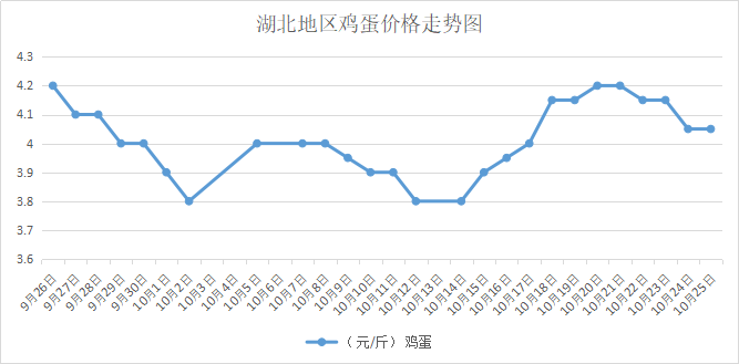 鸡病专业网消息:10月25日,湖北新洲红蛋4.05元/斤,稳;武南红蛋4.5元/斤,稳,粉蛋4.45元/斤,稳;麻城鸡4.05元/斤,稳;孝感鸡蛋4.05元/斤,稳。