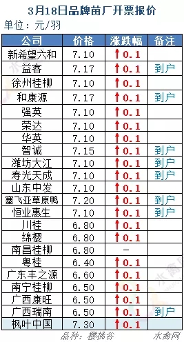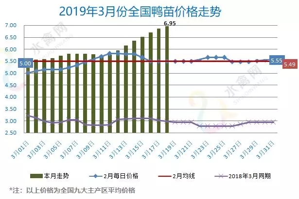 最新行情:明日上游端鸭苗、种蛋行情涨势延续、幅度收窄。除江西报价暂稳外,其他各主要区域品牌孵化厂家开票价格上调0.1元/羽。全国监测区域鸭苗成交均价6.95元/羽,较去年3月同期上涨4.0元/羽,涨幅135.6%,环比2月上涨1.46元/羽。