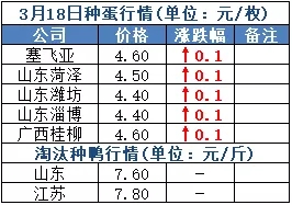 3月17日全国商品鸭出栏价格区域上扬、活禽反弹。周末以来,中南华南地区阴雨渐退,广东活禽市场亦迎来量价齐升、报价上涨,今天各地白鸭普涨0.1-0.2元/斤,主流收购价4.0-4.3元/斤。广西方面维持暂稳。