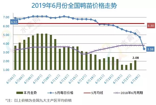 最新行情:明日上游端鸭苗、种蛋行情反转上扬、节节回升。北苗大幅跳水后、价格跌回一字时代,目前南北区域价格差距拉开、调运相对活跃。明天各区域主流孵化厂家报价全线上涨,价格上调幅度在0.3-0.5元/羽不等。全国监测区域鸭苗成交均价2.08元/羽,较去年6月同期下跌1.41元/羽,跌幅40.4%,环比5月下跌4.22元/羽。