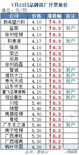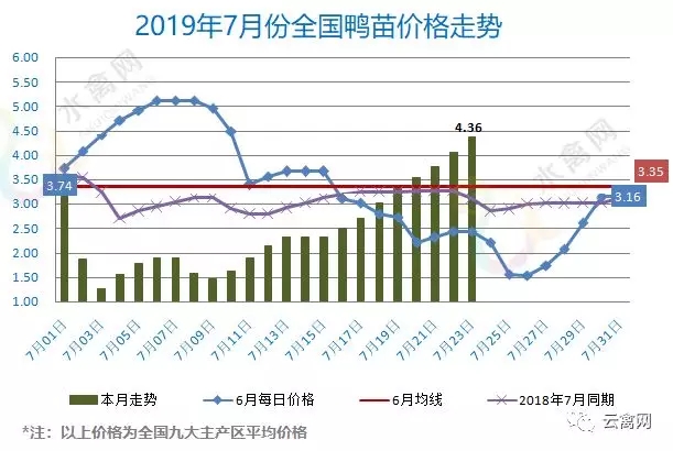 最新行情:明日上游端鸭苗、种蛋行情节节上行、全线普涨,各区域主流孵化厂家开票报价上调0.3元/羽。全国监测区域鸭苗成交均价4.36元/羽,较去年7月同期上涨0.87元/羽,涨幅24.9%,环比6月上涨1.01元/羽。