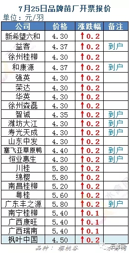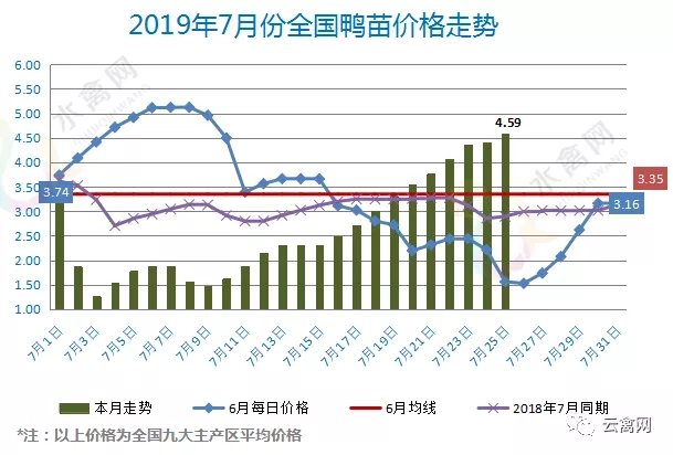 最新行情:明日上游端鸭苗、种蛋行情接续上行、涨幅收窄,各区域主流孵化厂家开票报价上调0.1-0.2元/羽不等。北方冷藏限价,鲁豫皖苏地区小白条厂家停放较多,苗厂挺价观望。全国监测区域鸭苗成交均价4.59元/羽,较去年7月同期上涨1.10元/羽,涨幅31.6%,环比6月上涨1.24元/羽。