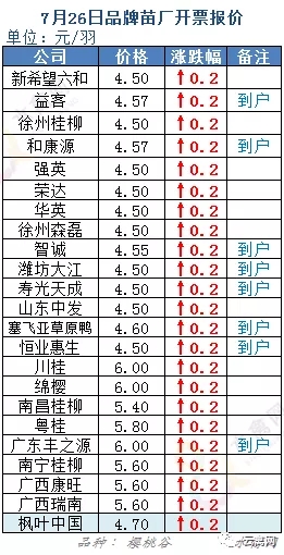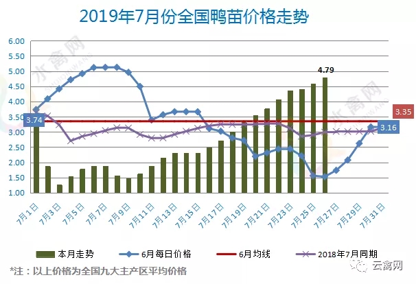最新行情:明日上游端鸭苗、种蛋行情普涨飘红、破局向上,各区域主流孵化厂家开票报价普遍上涨0.2元/羽。自本月中旬以来,鸭苗从低位中恢复、持续连涨,近期北方冷藏限价,鲁豫皖苏地区小白条厂家停放较多,苗厂抱团坚守、并反向上调报价。全国监测区域鸭苗成交均价4.79元/羽,较去年7月同期上涨1.30元/羽,涨幅37.2%,环比6月上涨1.44元/羽。
