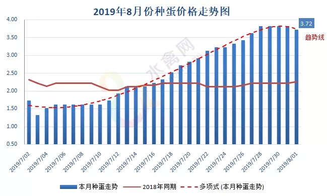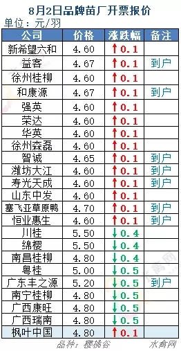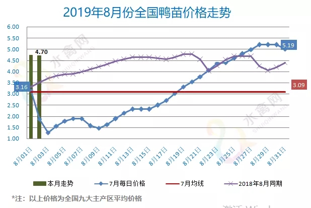 最新行情:明日全国鸭苗行情区域分化、南跌北涨,北方鲁豫皖苏地区苗价止跌回升,台风登陆海南,中南华南区域主流孵化厂家报价下行延续,跌幅0.4-0.5元/羽不等。全国监测区域鸭苗成交均价4.70元/羽,较去年8月同期上涨0.40元/羽,涨幅9.9%,环比7月上涨1.61元/羽。