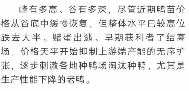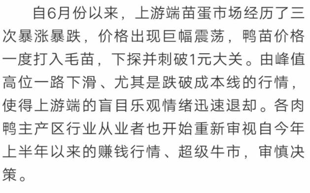 近期进入全年中气温最高、潮湿、闷热的三伏天,鲁豫皖苏省份地区是我国樱桃谷肉鸭重要的种鸭密集养殖带,历年来北方的高温、台风极端天气、夏季停电事故等都对一线带来较大困扰,受精率降低、产蛋下降,养殖风险加大等不同程度不利影响。预计三伏40天上游端产能呈稳中趋降态势,但基于整体的行业性过剩,价格的反弹高度或将有限。目前,经过持续性的恢复调整,北方鸭苗价格已逼近5元关口,如鸭产品端市场出货未能显著改善,则后续将面临支撑不足、进入新一轮的滞涨、下行。