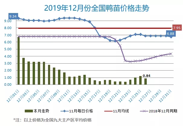 最新行情:明日全国鸭苗价格暴跌寻底、全线飘绿,各区域主流孵化厂家参考报价普跌,下滑幅度在0.2-0.6元/羽不等。北方冷藏企业大分割厂家原料投放恢复,小白条厂仍处于停放阶段,近期苗厂一度试探性上调报价、力图恢复市场信心,但好景不长、昙花一现,在整体出孵日增的压力下、各地价格旋即普跌走低。全国监测区域鸭苗成交均价0.45元/羽,较去年12月同期下跌5.28元/羽,跌幅92.1%,环比11月下跌7.50元/羽。