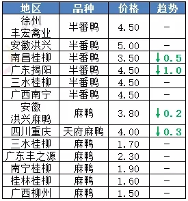 | 广西 | 南宁(水鸭) | 3.50 | -0.30 |