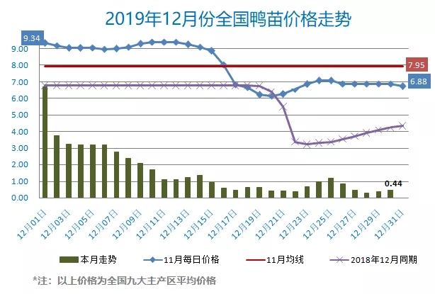最新行情:明日全国鸭苗价格底部徘徊、北涨南稳。北方冷藏屠宰小白条厂开始投放,孵化企业试探上涨、象征性上调报价0.1元/羽。全国监测区域鸭苗成交均价0.44元/羽,较去年12月同期下跌5.29元/羽,跌幅92.3%,环比11月下跌7.51元/羽。