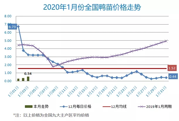 最新行情:明日全国鸭苗价格底部徘徊、震荡回升。除西南四川价格暂稳外,其他区域主流孵化厂家参考报价上调0.2元/羽。目前北方冷藏屠宰端分割及小白条厂家合同投放全线恢复,孵化企业试探调价、小幅拉涨。全国监测区域鸭苗成交均价0.54元/羽,较去年1月同期下跌2.87元/羽,跌幅84.2%,环比12月下跌0.98元/羽。