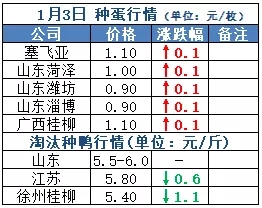 1月2日全国商品鸭出栏价格活禽止跌企稳、北方继续下探。元旦假期期间各地规模屠宰企业大多停工放假一天,北方市场鸭行情加速下行,目前山东、江苏多地收购价跌破3元。南方两广止跌回升,今天广西水、旱鸭反弹上涨0.2元/斤,广东惠州、汕尾、湛江等地亦有微涨。(详情见附表)。全国监测区域毛鸭收购均价3.09元/斤,较去年同期下跌1.19/斤,跌幅27.8%。