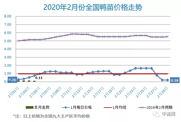 最新行情:今天是农历新年正月初十,明日全国鸭苗价格无量无价、谷底徘徊,打包销毁行情持续。全国监测区域鸭苗成交均价0.11元/羽,较去年2月同期下跌5.38元/羽,跌幅98.0%,环比1月下跌0.85元/羽。
