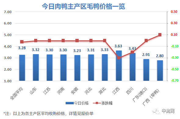 最新行情:明日上游端鸭苗、种蛋行情苗蛋齐跌、北方下滑,其中北方鲁豫皖苏地区品牌苗厂计划放缓,开票报价普跌0.2元/羽,南方两广、江西及四川地区维持暂稳。