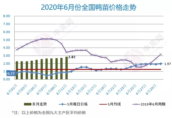 最新行情:明日上游端鸭苗、种蛋行情激情连涨、节节上扬,各区域主流孵化厂家开票报价普涨0.1-0.2元/羽不等,北苗距离3元仅一步之遥,南方亦紧追直上。全国监测区域鸭苗成交均价2.82元/羽,较去年6月同期下跌0.53元/羽,跌幅15.8%,环比5月上涨1.56元/羽。