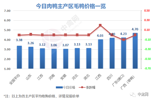 6月10日全国商品鸭出栏价格区域调整、涨跌互现。近期南方多雨,尤其是广东地区连续出现暴雨、局地洪涝严重,对一线出栏及市场走货均产生不利影响。今天广东大鸭普跌0.1元/斤,白鸭主流成交参考4.15-4.30元/斤,泥鸭采购指导价4.4-4.5元/斤。江西小幅补涨,广西暂稳,北方鲁豫皖苏等地整体报价不动(详情见附表)。全国监测区域毛鸭收购均价3.38元/斤,较去年同期下跌0.66元/斤,跌幅16.3%。