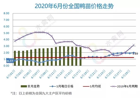 最新行情:明日全国鸭苗价格抱团坚守、孵化挺价,除江西小幅下调外、其他各区域主流孵化厂家开票报价维持暂稳。全球疫情加速恶化,北京新发地检出病毒事件将成为影响下半年行情的重大变动因素、也将成为影响冰鲜品进程、以及肉类进出口等的标志性事件。全国监测区域鸭苗成交均价2.85元/羽,较去年6月同期下跌0.50元/羽,跌幅14.9%,环比5月上涨1.60元/羽。
