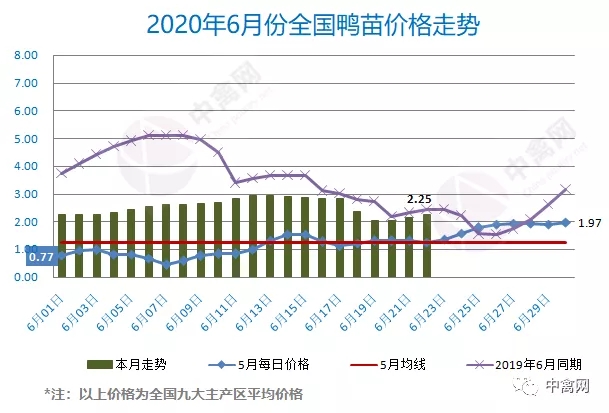 最新行情:明日上游端鸭苗、种蛋行情试探上调、飘红连涨,各区域主流孵化厂家开票报价普涨0.1元/羽。本周鸭产品端走货稳中偏向好转,大规格白条及部分分割、副产品价格走高,上游孵化企业惜售挺价、抱团联涨。全国监测区域鸭苗成交均价2.25元/羽,较去年6月同期下跌1.10元/羽,跌幅32.8%,环比5月上涨0.99元/羽。