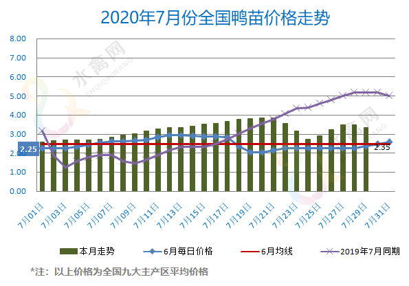 最新行情:明日上游端鸭苗、种蛋行情支撑不足、全线跌落,除广东、四川暂稳外,其他区域主流孵化厂家开票报价下滑0.1-0.2元/羽不等。7月中旬以来鸭产品市场涨价遇阻、横盘整理,而原料端投入品鸭苗、饲料等价格大幅度上涨,加之今年鸭疫情流行,料比上升、成活率下降,成本剧增之下屠宰环节企业经营风险持续放大,近期再度停放、鸭苗采购限价。全国监测区域鸭苗成交均价3.32元/羽,较去年7月同期上涨0.23元/羽,涨幅7.4%,环比6月上涨0.85元/羽。