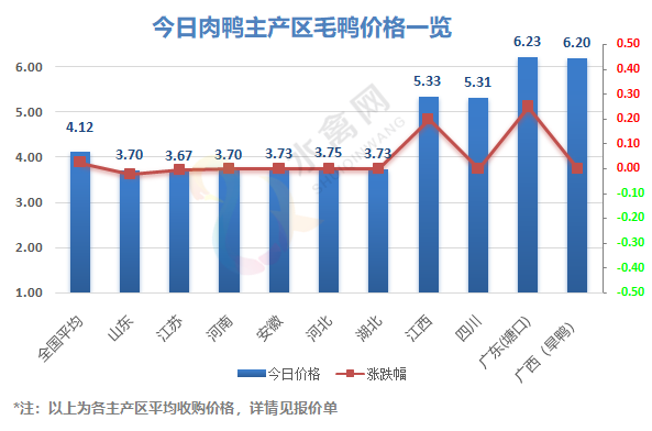 南方市场广东大鸭行情再度启动,价格领涨全国,今天各地采购商报价上涨0.2-0.3元/斤不等,50日龄以上白鸭主流成交价格参考6.1-6.30元/斤,时隔四个月再度重上6元大关。外围江西、湖南价格联动跟涨。泥鸭方面两广厂家采购指导价格参考6.7-6.9元/斤(详情见正文内附表)。全国监测区域毛鸭收购均价4.12元/斤,较去年同期上涨0.16元/斤,涨幅4.2%。
