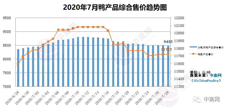 7月28日监测数据,目前鸭分割产品综合售价参考8483元/吨,环比6月上涨425元,涨幅5.27%;鸭副产品售价11723元/吨,环比6月上涨2.67%。本月鸭产品价格运行趋势图如下: