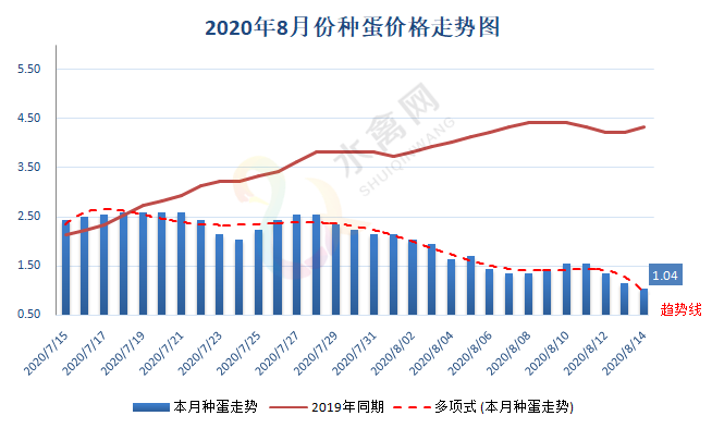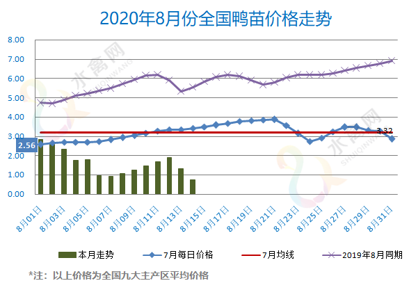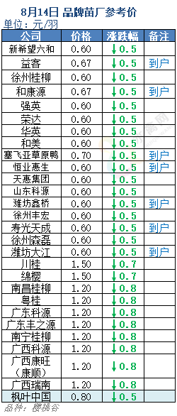 最新行情:明日全国鸭苗价格雷霆暴跌、直奔毛苗,北方规模冷藏企业鸭苗采购限价,继昨天报价大跌之后再度出现巨幅调整,明天鲁豫皖苏地区品牌厂开票报价普跌0.5元/羽,华南两广、江西、四川等地联动跟跌。全国监测区域鸭苗成交均价0.75元/羽,较去年8月同期下跌5.12元/羽,跌幅87.2%,环比7月下跌2.46元/羽。